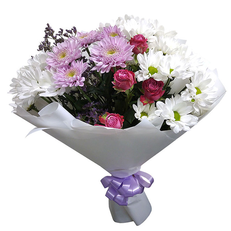 Состав: роза кустовая, кустовые хризантемы (55-60 см.), дополнительное декорирование, оформление калька, лента.