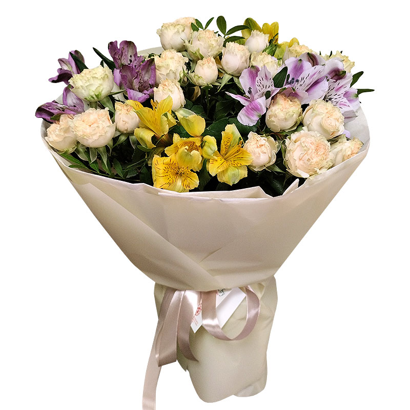 Состав: 5 веток пионовидной кустовой розы (55 см.), 4 альстромерии, дополнительное декорирование зеленью, оформление тишью, калька, лента.