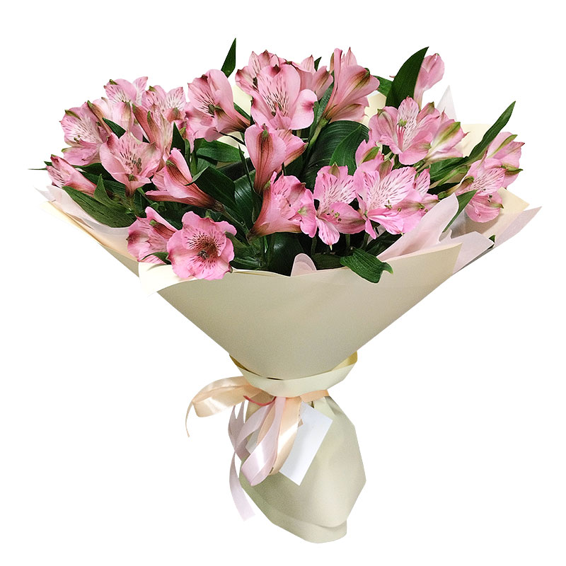 Состав букета: альстромерия 7 (55-60 см.), дополнительное декорирование зеленью, оформление калька, лента.