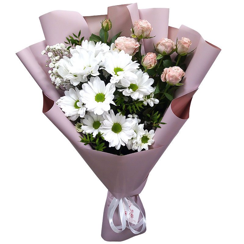 Состав: букет с кустовой розой (60 см.) 1, кустовой хризантемой 2, дополнительным декорированием цветами гипсофилы, зеленью, оформление калька, лента.