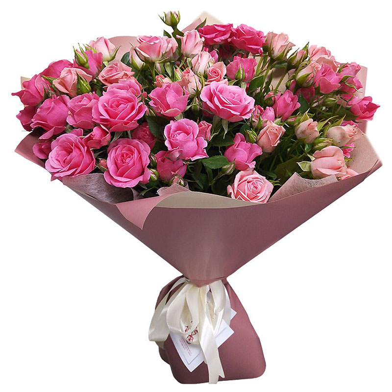 Состав: кустовая роза (11 шт., 55-60 см.), оформление фетр, калька, лента.