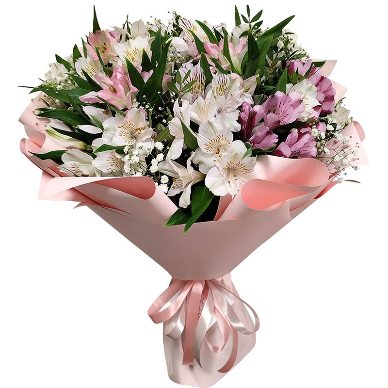 Состав: 11 веток альстромерий (55-60 см.), дополнительное декорирование гипсофилой, зеленью, оформление калька, лента.