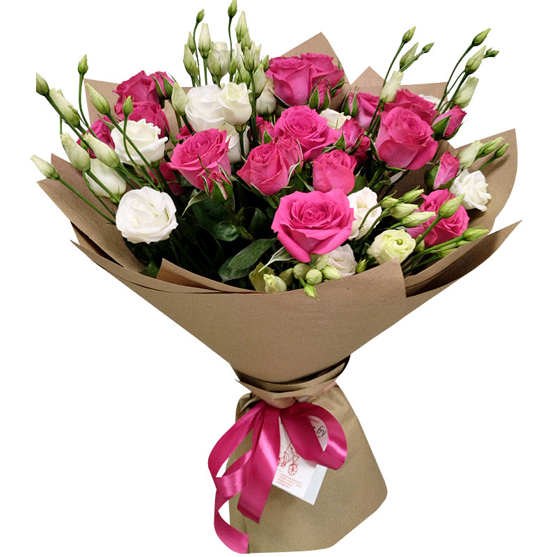 Состав: 5 кустовых роз (50 см.), 4 ветки эустомы, оформление крафт, лента.