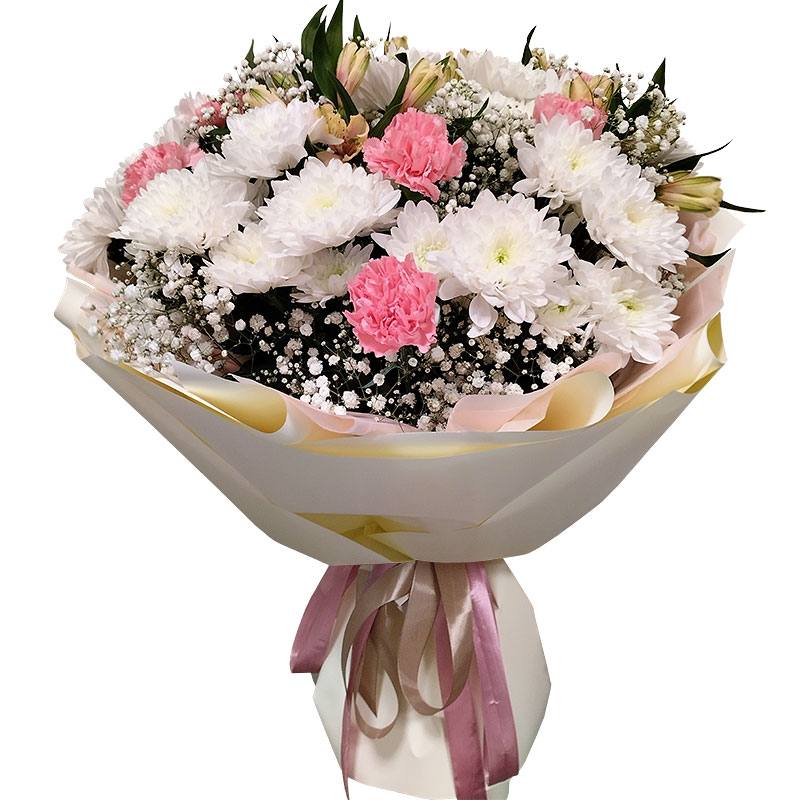 Состав: хризантема кустовая 5 (55-60 см.), альстромерия 5, гвоздика 7, дополнительное декорирование гипсофилой, оформление калька, лента.